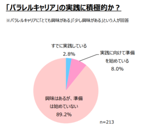 一方で、実際にパラレルキャリアを実践している人は2.8%、準備を始めている人は8.0%とまだまだ少なく、動き出せていない人が89.2%を占めます。