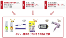 達成条件に応じて健康ポイントが付与され、商品と交換できるシステムになっています。