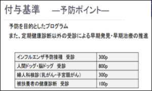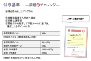 例えば、定期健康診断以外の健康管理をした人や、禁煙チャレンジと題して禁煙を達成した人に対して健康ポイントを付与する基準を作りました。