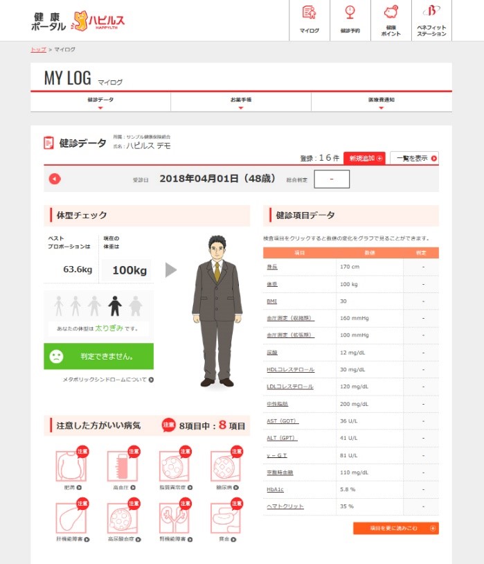 従業員は、健診結果をポータルサイト上で経年管理をすることができ、健診結果に応じて疾病リスクのある病気がアイコンで表示されることで、自身が注意すべき病気を事前に把握したり、病気の改善アドバイスを確認することができます。