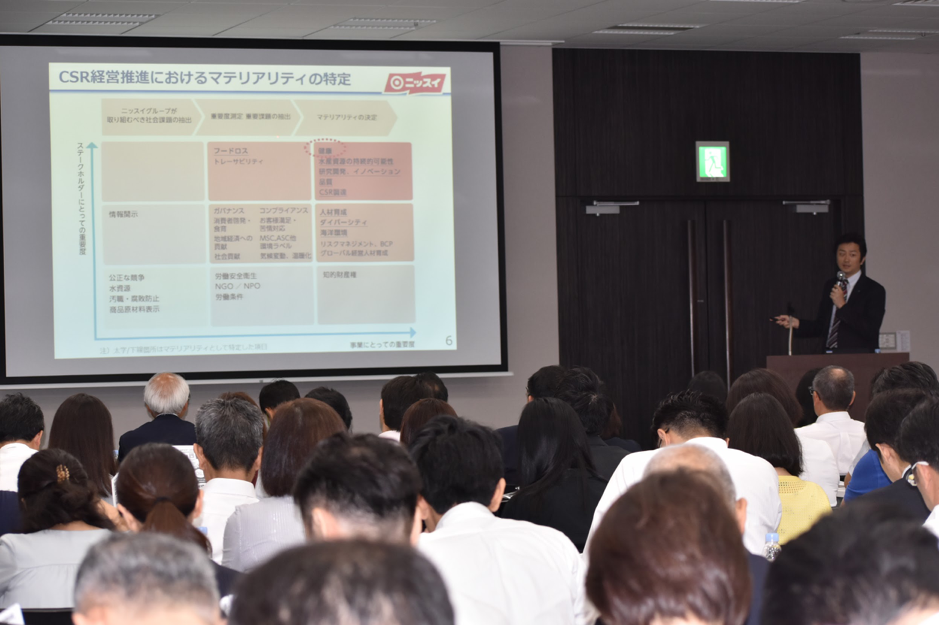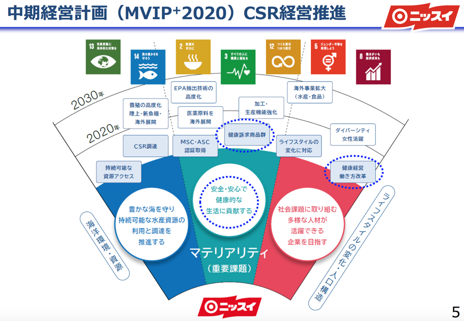 中林氏によると、同社は、中期経営計画(MVIP+2020)CSR経営推進について、国連のSDGs(持続的開発目標)とも連携させながら、2030年を目指して日本水産が取り組んでいくマテリアリティ(重要課題)を定め、それに沿って活動を進めているとのこと。