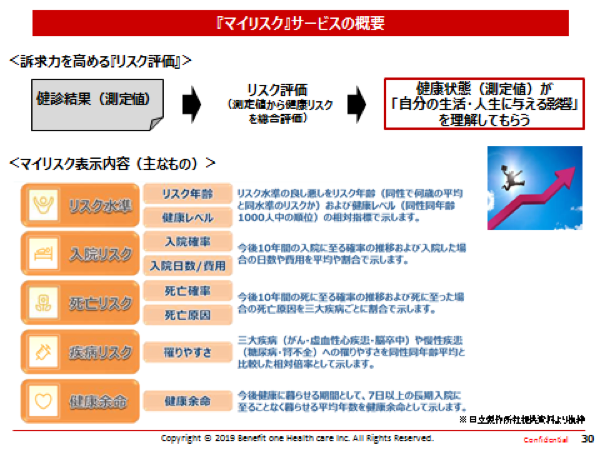 特に、健診、保健指導、健康ポイント等をワンストップで対応できることが同社の特徴とのこと。