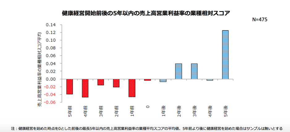 こちらの表は健康経営を開始した年を「0」とした際の、5年前から5年後まで の売上高営業利益率の業種相対スコア(業種内において健康経営を推進した企業の 利益率が相対的に高いか低いかを把握する指数)の平均値を比較したもの。