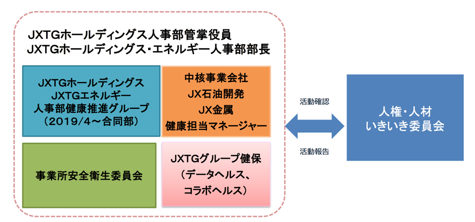 JXTGグループでは、JXTGグループ理念の大切にしたい価値観に安全・環境・健康を掲げ、JXTGグループで働く私たちが事業活動を通じて理念を実現し、社会的責任を果たしていくために実践すべき14の行動基準を定めている。その中に「健康推進」といった項目があるのだそうで、概要は以下の通り