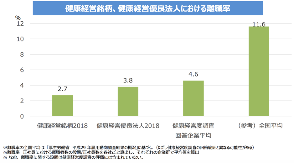 実際に健康経営度調査を分析すると、健康経営度の高い企業の方が離職率は低い傾向にあり、 2017年における全国の一般労働者の離職率と比較しても低いという結果が出たのだそうです。