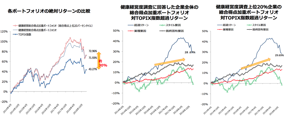 業種要因や景気変動要因を除外しても、健康経営調査上位20パーセントぐらいの対TOPIX強化指数リターンは、非常にプラスに伸びているとのこと。
