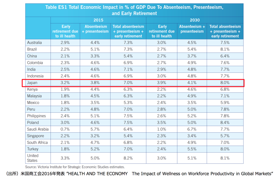 こちらの表は2年前にアメリカの商工会議所が発表した、アブセンティーイズム、プレゼンティーイズム、アーリーリタイアメントの3つがGDPをどれだけ引き下げているのかを試算したもの。