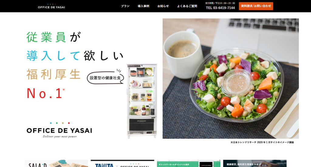 オフィス内に専用の冷蔵庫(冷凍庫)を設置するだけで、従業員は好きな時に新鮮なサラダやカットフルーツ、国産にこだわった食材を使用した無添加の惣菜などをオフィスで気軽に食べられます.