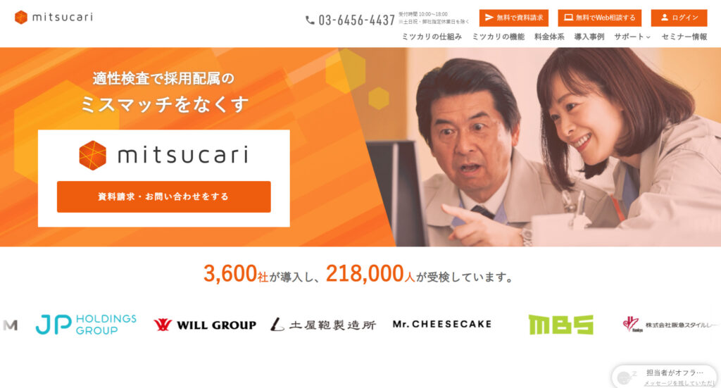 mitsukariは、採用時におけるプロセスや評価を分析し、どの面接官であっても適正な評価が行える仕組みを持っています。面接結果の評価から、配属先のグループとのマッチ度を計測したりs、ストレス耐性や配属時におきそうなミスマッチまで予測を行えます。無料トライアル期間もあり中小企業でも導入しやすいサービスです。