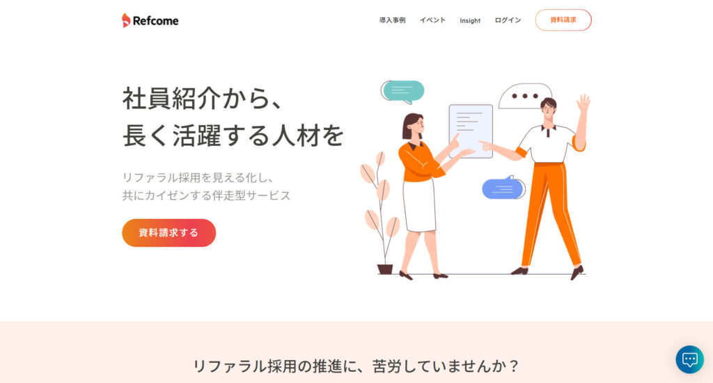 Refcomeはクラウドサービスで、リファラル採用を促進するサービスです。Refcomeを導入することによって採用担当者の業務や紹介状況などのデータが一元管理でき、よりリファラル採用を効率的に促進できます。また、豊富な導入実績やノウハウを持った担当が在籍しているため、成功に導く支援を行ってくれます。