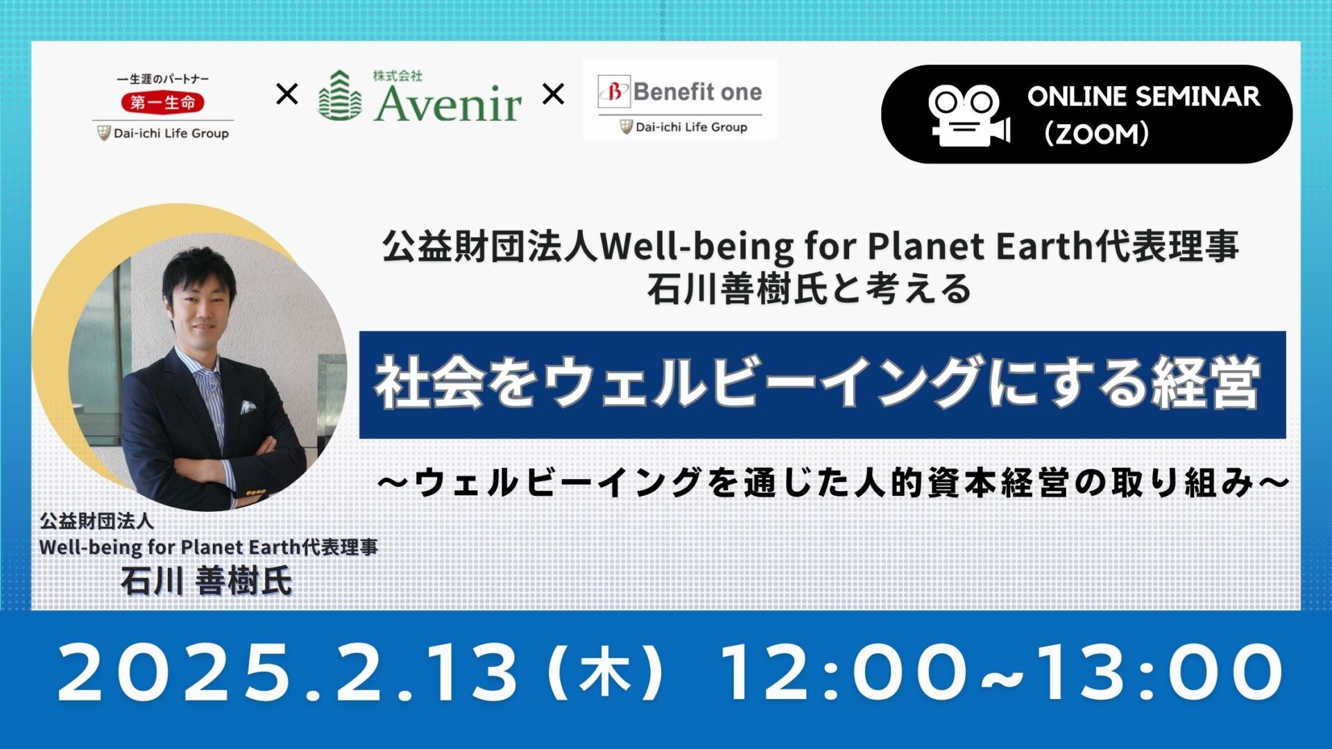 セミナー 公益財団法人Well-being for Planet Earth代表理事 石川善樹氏と考える 社会をウェルビーイングにする経営~ウェルビーイングを通じた人的資本経営の取り組み~ 最終更新日:2025.01.17