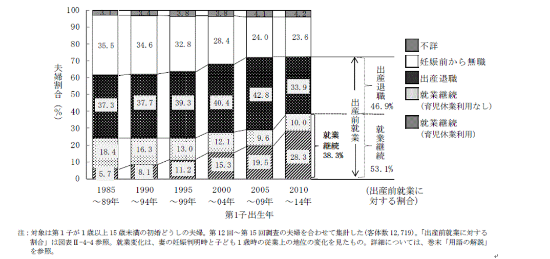 日本では第一子出産前後で退職する女性は約50%にのぼります。第改善しているものの約半数の女性が出産をきっかけに仕事を辞める状況が続いています。