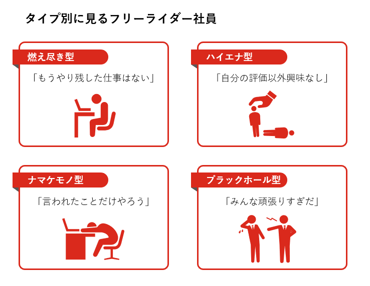 このように、「フリーライダー社員」には複数のタイプがあります。
