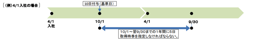- 労働者ごとに、初めて年次有給休暇を付与した日を「基準日」とし、その日から1年以内に5日間の有給休暇を取得することが義務となる。その時季は使用者が労働者と話し合いの上で決めることが出来る。つまり、年度初めの4月から3月までという計算ではない。