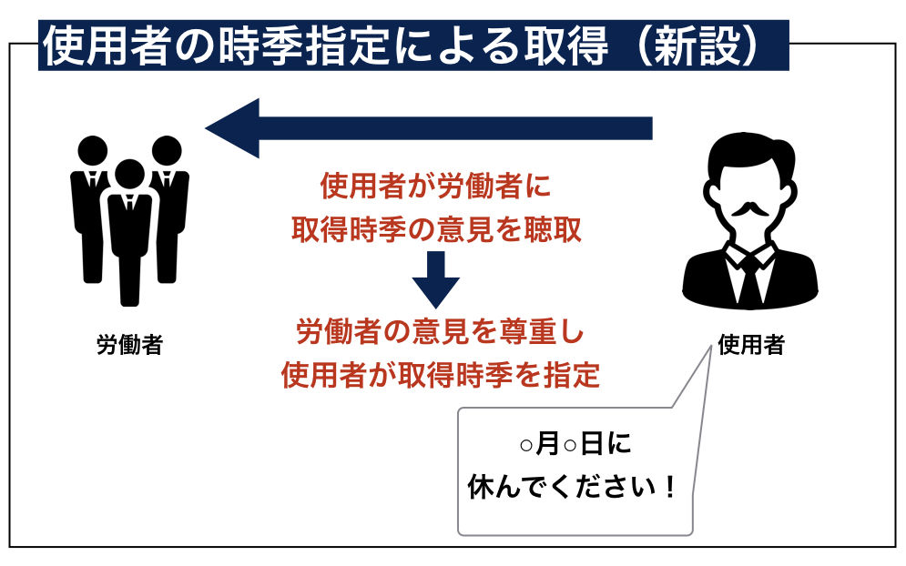 労働者の要望を聞いた使用者はそれを考慮して、「○月×日に休んでください」と有給休暇の取得時季を指定する、というものです。