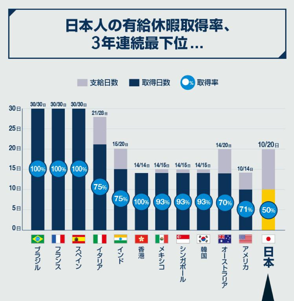ちなみにこのグラフでは、灰色が「会社が支給する有給休暇の平均日数」、紺色(日本の場合は黄色)が「実際に社員が取得している有給休暇の日数」を表しています。日本の場合では、支給日数が「20日」である一方、実際に取得できている日数は「10日」ということになります。