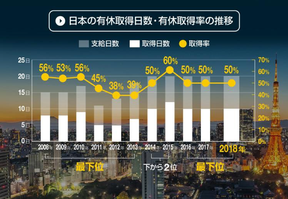 今回の年次有給休暇の義務化の背景には、日本人の有給休暇取得率の低さが大きく関わっています。