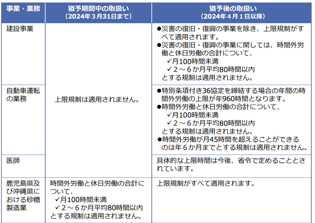 今回の法改正では、「医師」「自動車運転業務」「建設事業」など、時間外労働時間の上限の施行が2024年まで猶予される業種もあります。