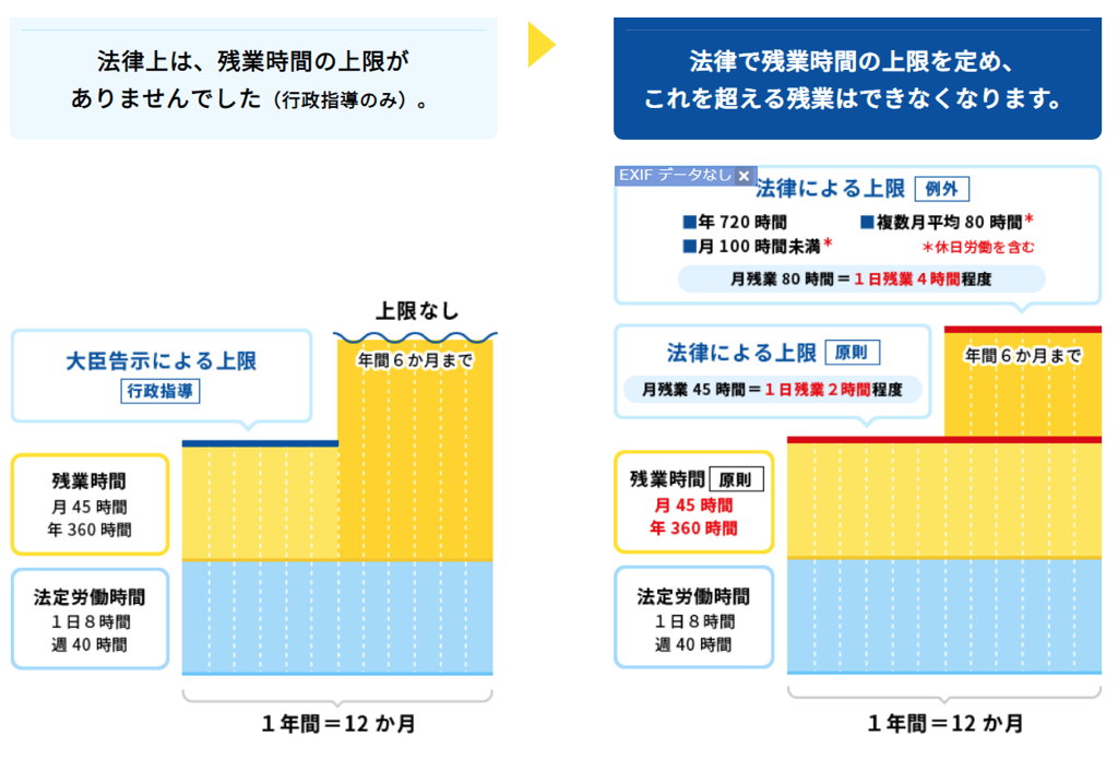 先ほど述べたとおり、時間外労働については改正前も「原則45時間/月、360時間/年」と上限が定められていました。